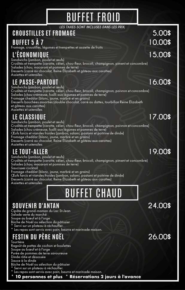 Suggestion buffets (vous avez également le choix de personnaliser votre buffet en contactant directement Les Cuisines Régal au 819-477-0219).
